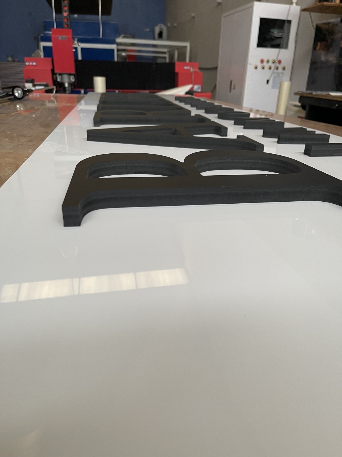 Notre cliente voulez une enseigne minimaliste et élégante nous lui avons alors conçu une enseigne en relief noir sur fond blanc.