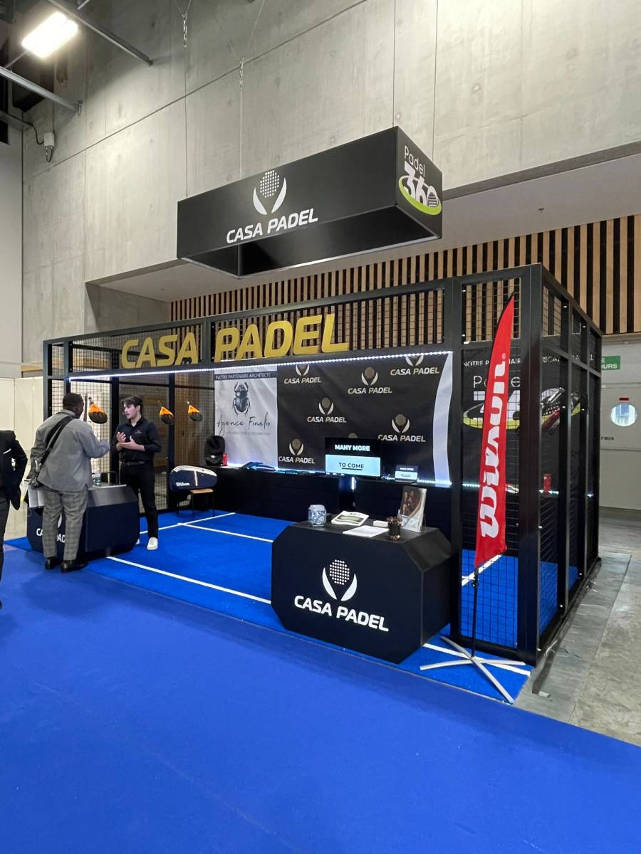 Conçue avec précision, l'enseigne suspendue guide le regard tout en renforçant l'identité du stand. Elle sert de point focal et attire les visiteurs vers l'espace d'exposition. L'ambiance unique est créée par le fond mural, une toile visuelle captivante, qui ajoute une dimension artistique à l'environnement du stand.