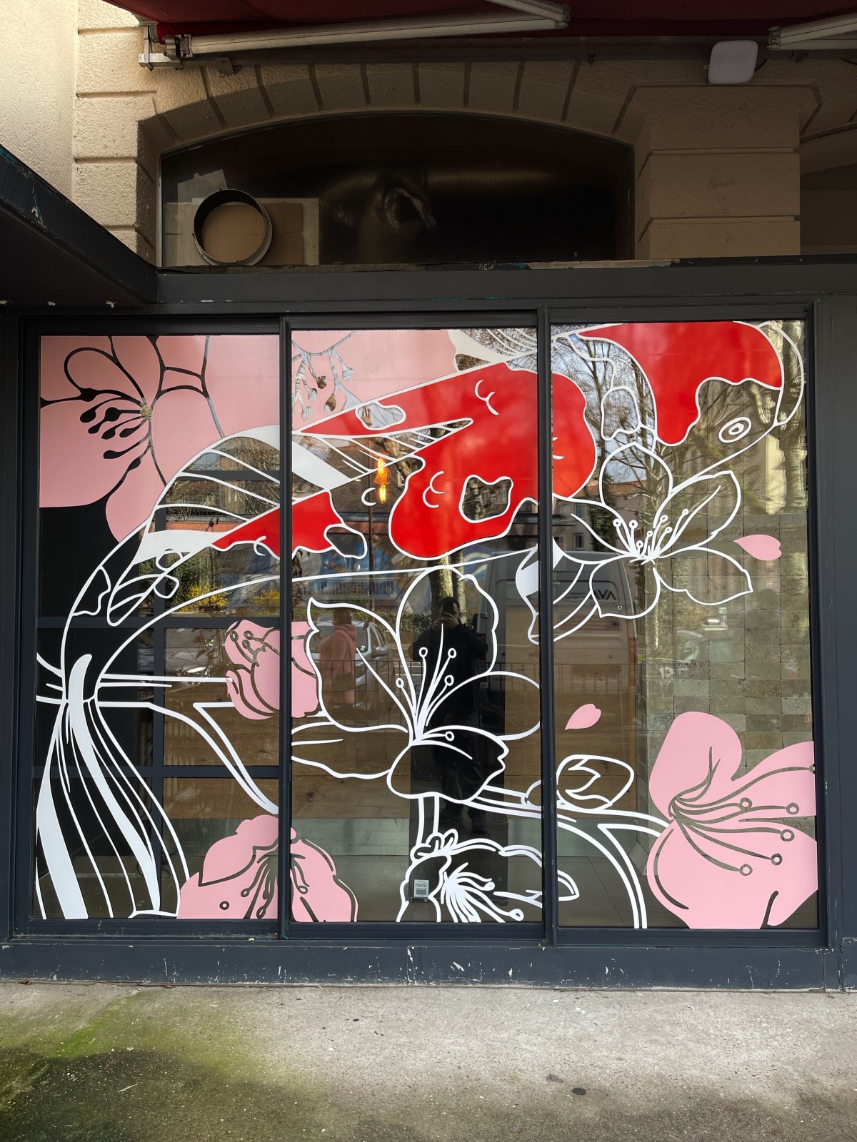 Après avoir fait des recherches sur le thème asiatique et les envies de notre client, nous avons pu faire la création du visuel pour la Vitrophanie décorative.