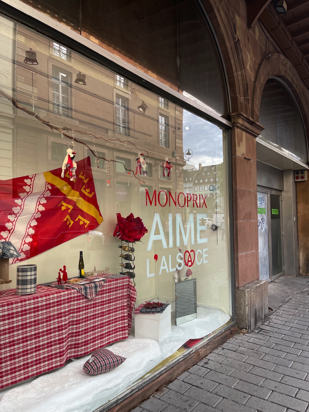 Cette vitrine étant dédier à notre Region Alsace nous avons crée un Marquage de vitrine qui augement la visibilité du Monoprix tout en representant la region Alsace.